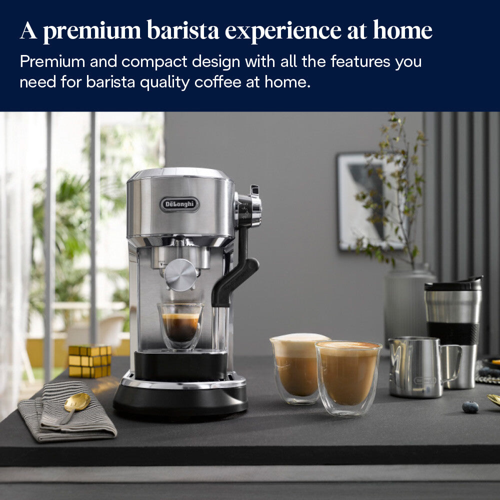 Exquisite taste combined with aesthetic pleasure. Dedica, the stylish pump espresso machine, now with My Latte Art steam wand: perfect to create the silky, fine texture to make your lattes and flat whites.