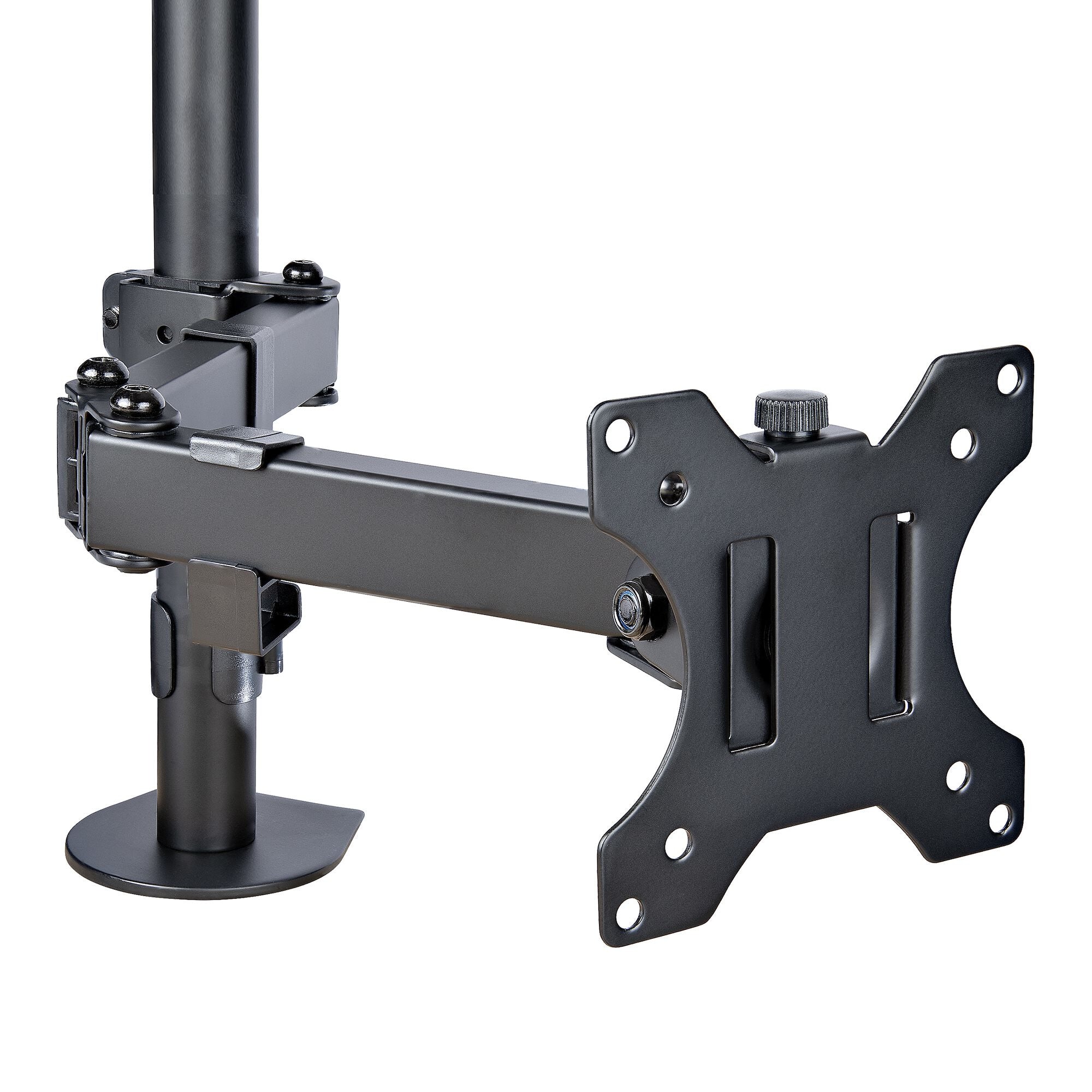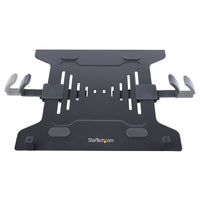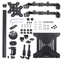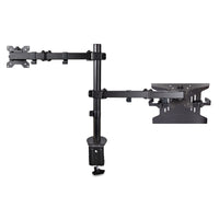 VESA Mount 75x75/100x100 | Laptop up to 9.4" to 16.5" Wide | Heigh AdjustmentIncrease your desk space and add versatility and ergonomics to your work/home setup with this VESA-compatible laptop and monitor desk mount. The laptop tray (11.8x11in / 300x280mm) is large enough to hold a laptop between 9.4-16.5in (240-420mm) wide, 1in (25.4mm) thick, and up to 10lbs (4.5kg). The monitor arm allows you to mount a VESA compatible (75x75mm or 100x100mm) display up to 32in with a maximum weight of 17.6lbs (8kg).Versatile compatibility and solid constructionThis well-ventilated laptop tray includes rubber pads to prevent scuffs and scratches. In addition, the tray features two independent adjustable padded arms that serve as a cradle to secure the laptop and can be independently positioned and secured along the sides of the tray to prevent blocking any port configuration on a laptop. The tray and monitor mount are both solid steel.Wide range of motionThe VESA mounts offer wide adjustability options such as tilt +/-45° swivel +/-90°; and rotation 360°. The height can be adjusted along the 17.4in / 443mm pole and the arms can also extend out a maximum of 15.7in / 399mm out. Two joints (at the pole and middle of the arms) allow them to swivel +/-180°.Ergonomic designThe multiple adjustment options allow the laptop to be positioned at eye level improving your posture and comfort, and when positioning the monitor mount beside it, enhances your screen real estate and productivity.Mounting optionsUsing the interchangeable desk clamp (C-clamp) you can easily attach and secure the mount to a desk or grommet hole by hand (grommet hole 0.39-2.36in / 10-60mm and desks 0.39-3.46in / 10-88mm thick). You can remove the laptop tray or monitor with no tools for hassle-free changes in your setup. To keep everything neatly arranged, cable management clips around the support arms keep the cables organized and out of the way.A2-LAPTOP-DESK-MOUNT is backed for 5-years by StarTech.com, including free lifetime 24/5 multi-lingual technical assistance.The StarTech.com Advantage