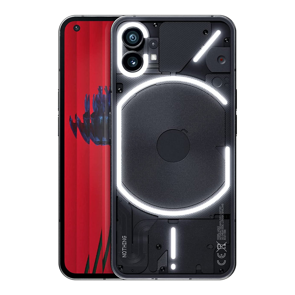 The Glyph interface of the Nothing 1 Phone offers a new way to communicate. It uses unique light patterns to indicate who is calling, notifications, charging status and more on a simple, straightforward interface. Being made of 100% recycled aluminium and leading industry, over 50% of the plastic components come from bio-based and recycled sources. So, you can do your bit and reduce the environmental impact of technology. The Nothing Phone 1 is available in Black and White. The dual cameras with 50MP sensors ensure extraordinary results every time you take a photo. And Night Mode allows you to capture any time of the day with brilliant results. Moreover, numerous other modes and options enable you to create the perfect images. Image stabilisation makes it possible to record videos without motion blur. So, you can instantly share experiences with friends. With its 6.55" OLED display featuring true-to-life colours, and an adaptive 120Hz refresh rate for responsive interactions, you can enjoy using this smartphone daily. In addition, HDR10+ ensures colours are richer, and you have deeper contrasts. The Qualcomm Snapdragon 778G+ mobile platform offers the performance you need in a modern smartphone. With either 8GB or 12GB RAM, you can have a smooth experience using any app. A generous 128GB or 256GB of storage means you have plenty of space for all your apps, photos and videos. The 4,500 mAh battery ensures you can enjoy using your smartphone for longer, as it offers a full day of uninterrupted usage. And the 33W charger will get you back up to full in just 70 minutes, ideal when you move around. In addition, there is 15W wireless charging and 5W reverse charging. Water and dust resistance to IP53 means you don't have to worry about the occasional rain shower.Nothing Phone 1 (SIM Free/Unlocked)